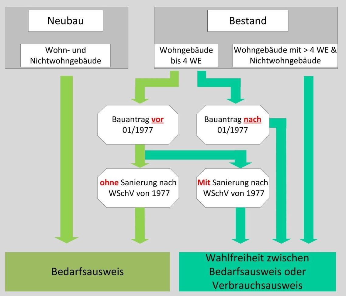 (Ausnahme: Das Gebäude hat mehr als 4 Wohneinheiten, in diesem Fall darf auch ein Verbrauchsausweis